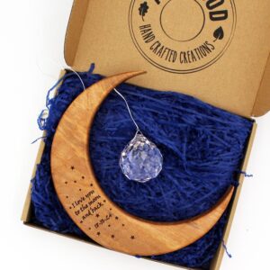 A very special gift. The Asfour Crystal Sphere prism hangs from a oak wood moon shape. The crystal prisms reflects wonderful colours when in direct sunlight. Hang in a window for direct sunlight to dance rainbows on your walls.