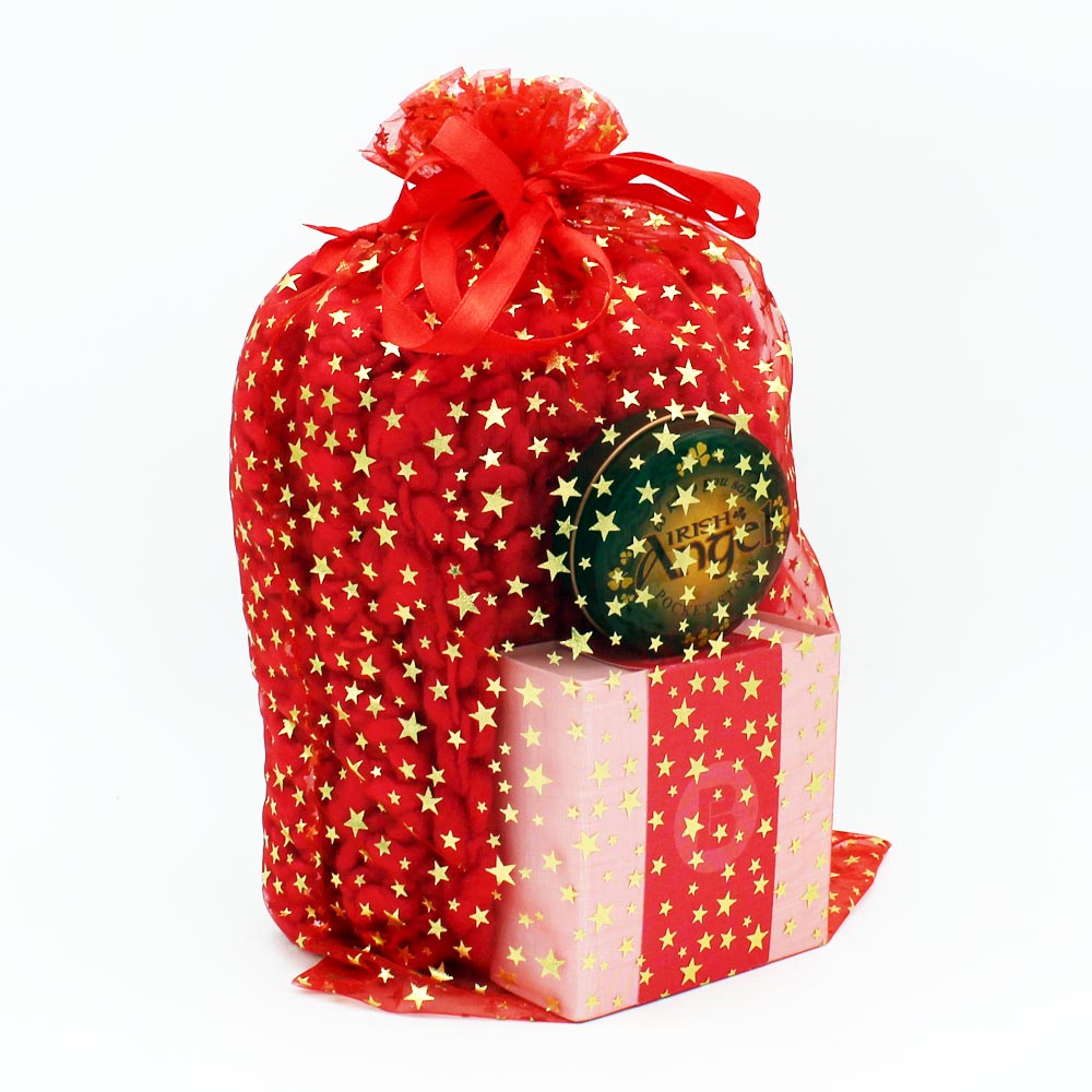 All three gifts are presented in a beautiful red with golden stars reusable organza bag.